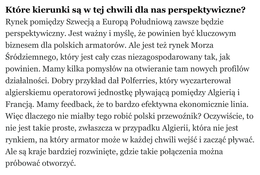 Rzeczpospolita opublikowała 9 kwietnia 2026 r. rozmowę Adama Woźniaka z Pawłem Pluto-Prądzyńskim, członkiem zarządu Polsca Baltic Ferries. Tekst dotyczy kondycji polskich armatorów, nowego promu Jantar i strategii budowania pozycji na Bałtyku. Nie dotyczy Portu Haller. Tym bardziej warto go przeczytać.