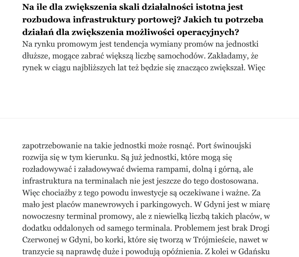 Pluto-Prądzyński opisuje infrastrukturę terminalową z perspektywy człowieka, który odpowiada za to, czy promy wychodzą z portu punktualnie. Gdańsk: terminal przy Westerplatte jest zbyt mały, potrzebuje remontu, a ograniczenia obrotnic są barierą dla dużych nowoczesnych jednostek, której żadna planowana modernizacja nie przeskoczy. Gdynia: terminal promowy stosunkowo nowoczesny, ale place manewrowe niewystarczające i fizycznie oderwane od nabrzeża. Brak Drogi Czerwonej sprawia, że korki trójmiejskie wpływają na każdy rejs, nawet tranzytowy. Świnoujście: port inwestuje i część tych inwestycji idzie w dobrym kierunku, ale infrastruktura terminalowa wciąż nie jest dostosowana do promów z dwupoziomowymi rampami, które już pływają.